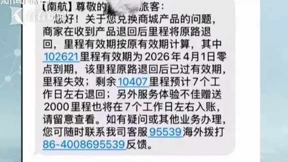 在退货过程中,由于前期沟通反复、处理周期延长,当事人的账户内部分里程于4月1日到期。4月3日,她收到南航方面通知,称退回里程已过期作废。