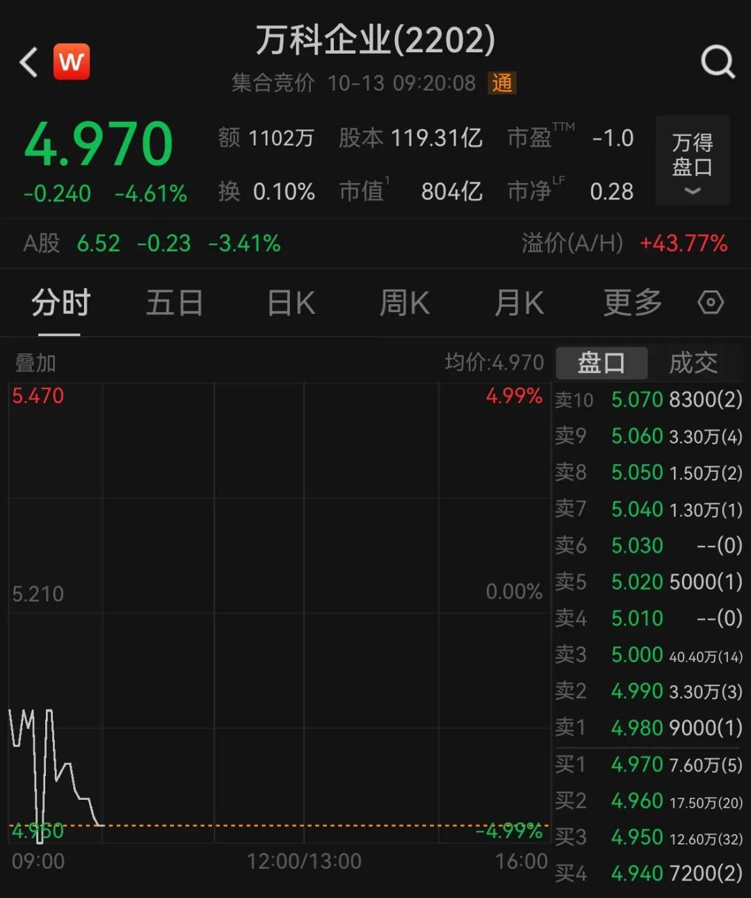 10月13日,港股万科大幅低开4.61%;A股方面,截至发稿,万科跌超3%。