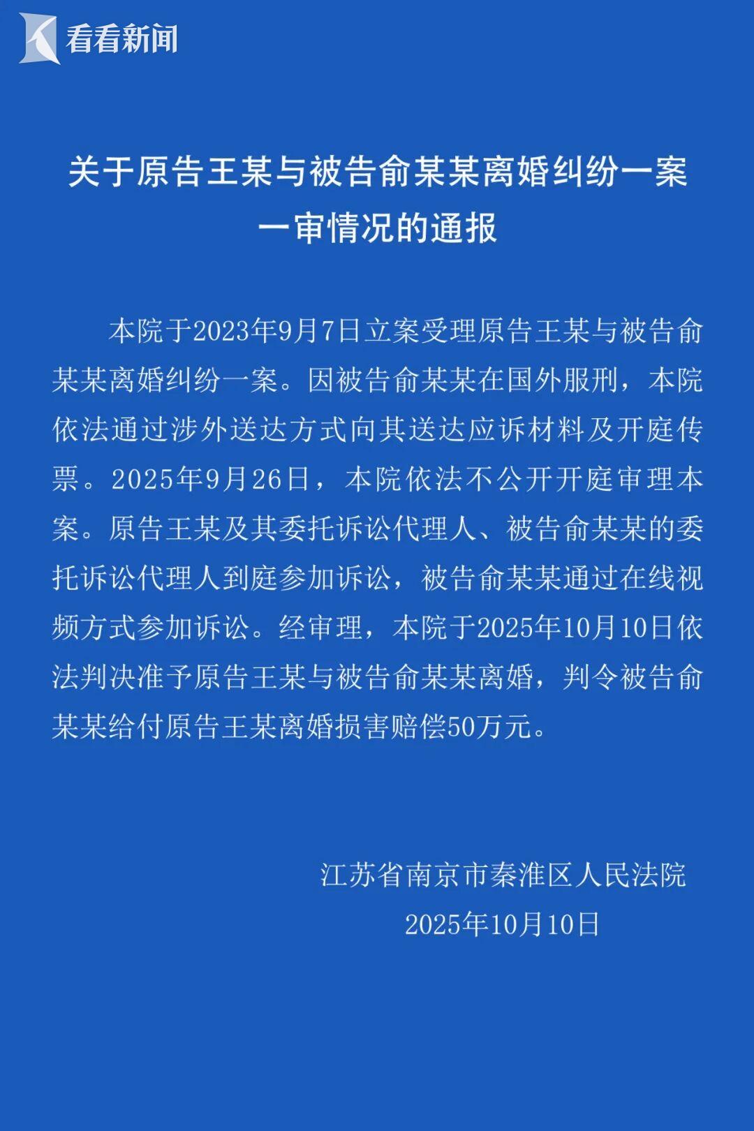 10月10日,江苏省南京市秦淮区人民法院发布“关于原告王某与被告俞某某离婚纠纷一案一审情况的通报”: