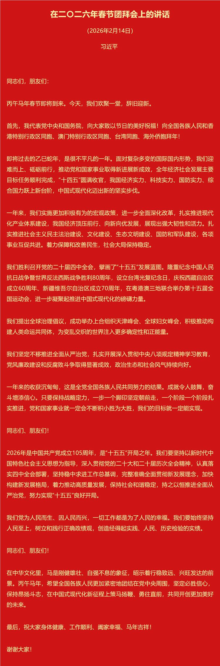 中共中央、国务院14日上午在人民大会堂举行2026年春节团拜会。中共中央总书记、国家主席、中央军委主席习近平发表讲话,代表党中央和国务院,向全国各族人民,向香港特别行政区同胞、澳门特别行政区同胞、台湾同胞和海外侨胞拜年。
