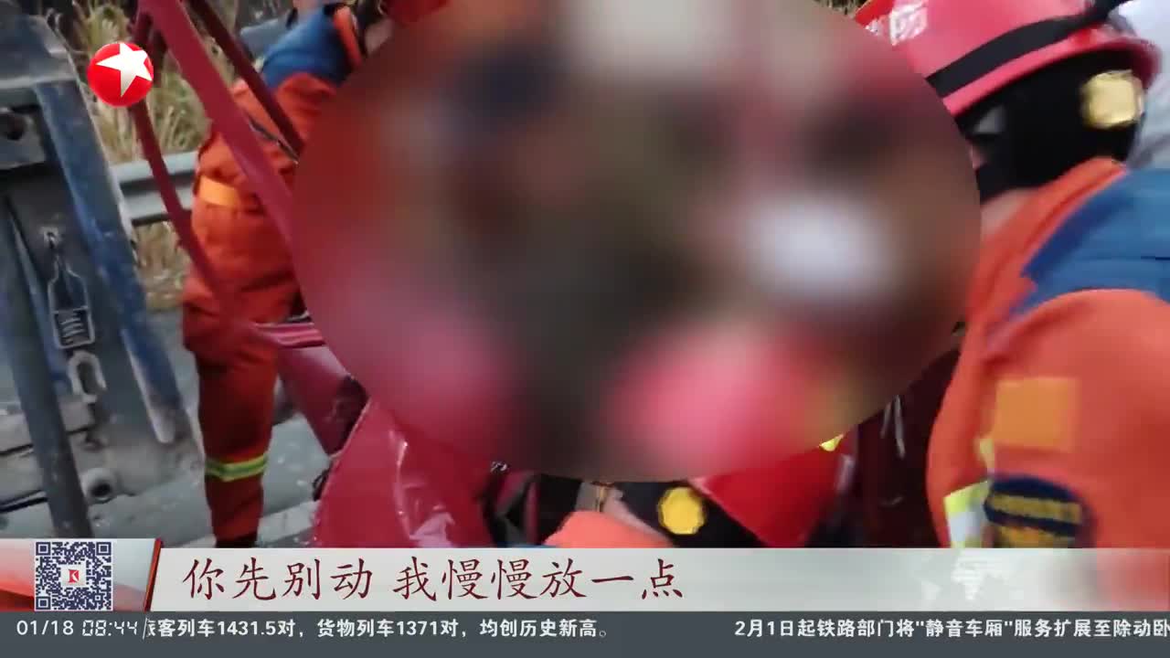 江西宜春:小车撞高速护栏严重变形 消防员“拆”出生路