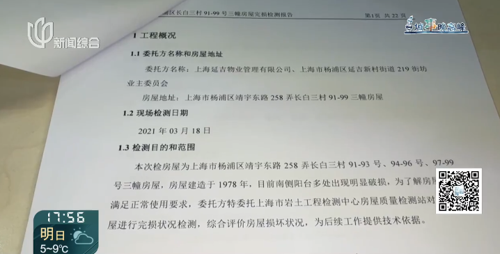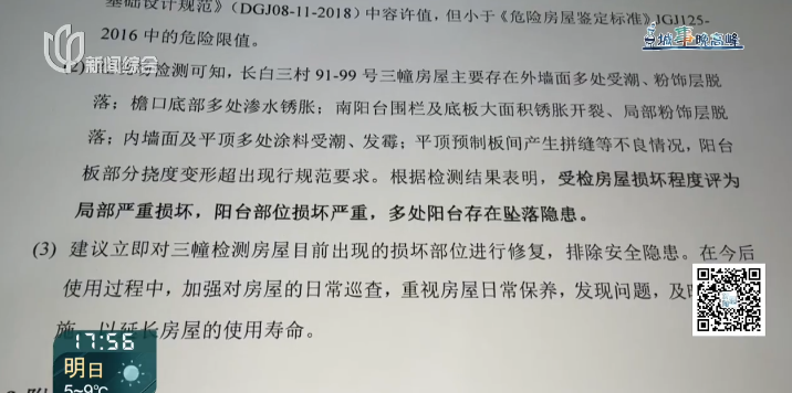 有居民门窗几个月后不能顺畅关拢,我们赶紧把这个情况跟延吉物业反映,沿街物业一看这个问题也比较严重,就请了第三方来进行了检测。检测报告上面也部分认为需要加快进行整修。