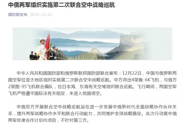 据两国国防部联合发布的消息,中俄此次联合空中战略巡航于12月22日在日本海、东海有关空域实施,中方派出4架轰-6K飞机,与俄方2架图-95飞机联合编队。而在2019年7月23日,中俄两国空军已组织实施了首次联合空中战略巡航。