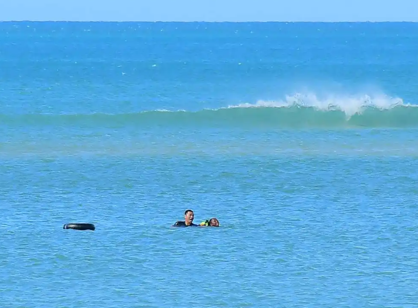 去年6月15日,在坦桑尼亚达累斯萨拉姆市海边,张军桥(左)营救溺水的当地女子。图源:新华社