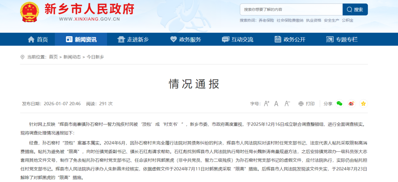 1月7日,新乡市“孙石窑村顶包案”联合调查整顿组发布情况通报,全文如下: