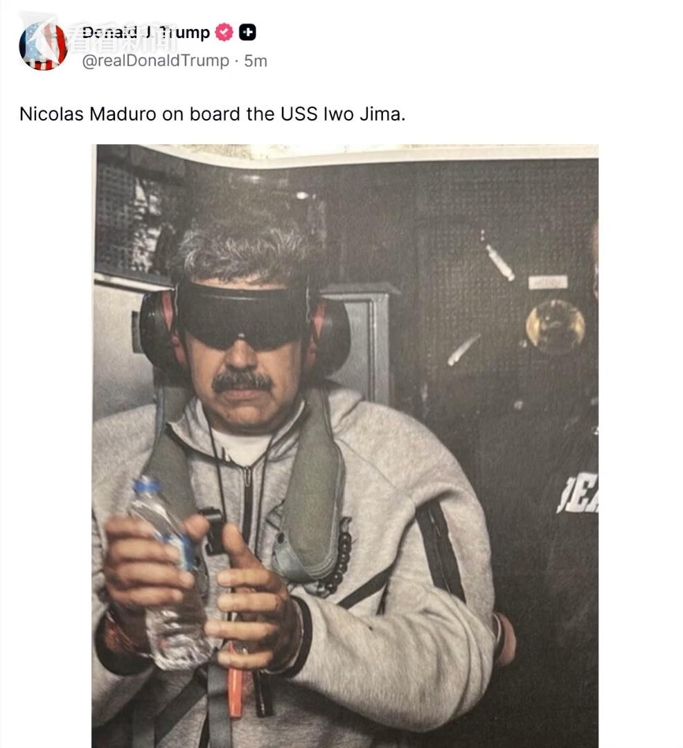 特朗普还在社交媒体上公布了一张马杜罗在“硫磺岛”号军舰上的照片。照片中的马杜罗戴着手铐,双眼被黑布蒙住。