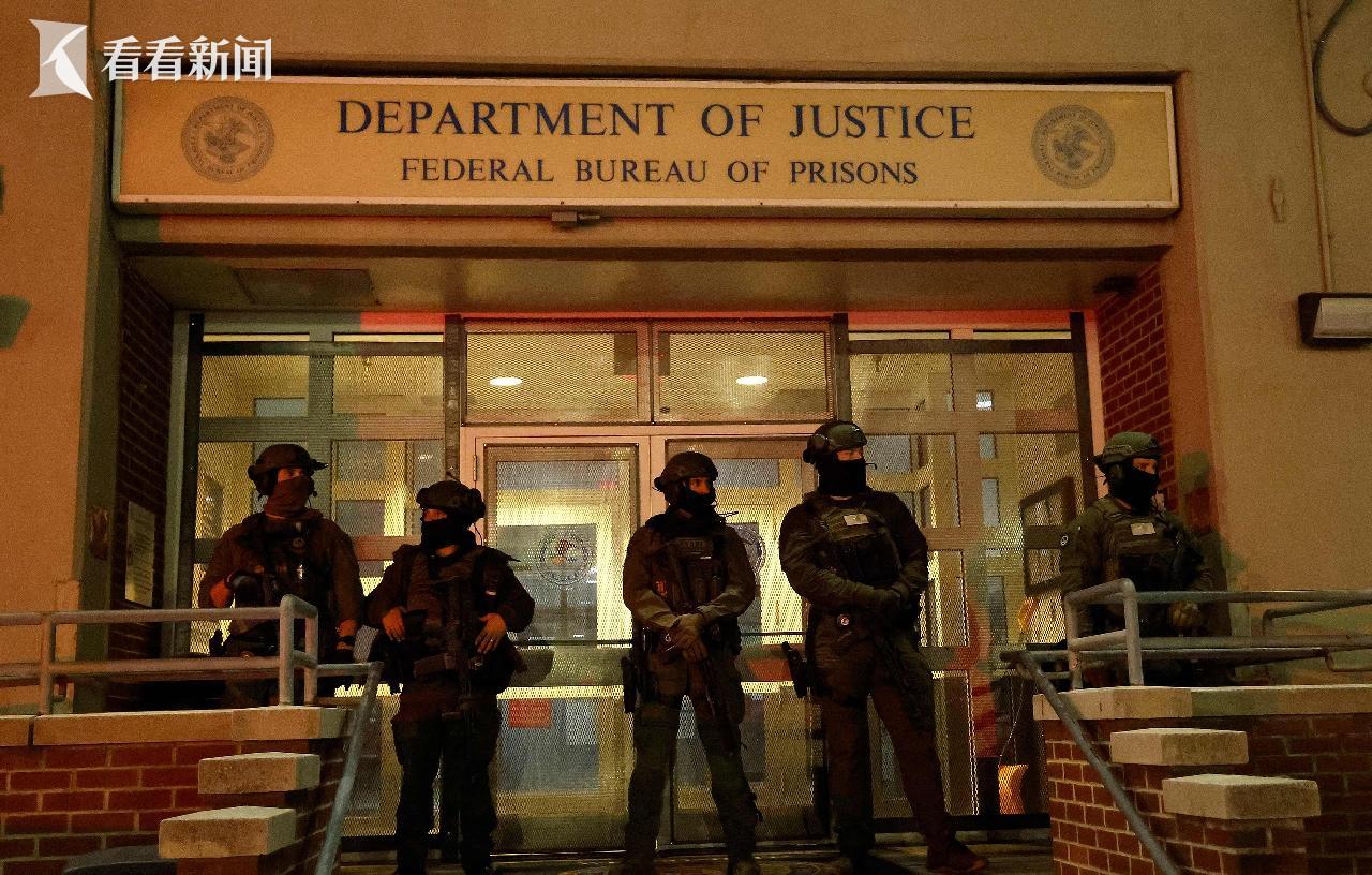 全副武装的警察站在纽约布鲁克林区大都会拘留所前