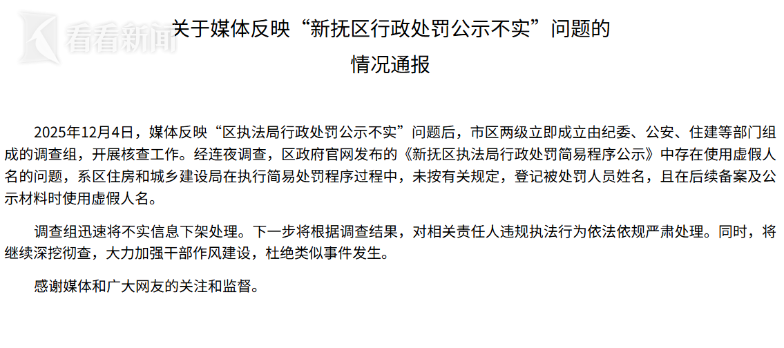 2025年12月4日,媒体反映“区执法局行政处罚公示不实”问题后,市区两级立即成立由纪委、公安、住建等部门组成的调查组,开展核查工作。经连夜调查,区政府官网发布的《新抚区执法局行政处罚简易程序公示》中存在使用虚假人名的问题,系区住房和城乡建设局在执行简易处罚程序过程中,未按有关规定,登记被处罚人员姓名,且在后续备案及公示材料时使用虚假人名。