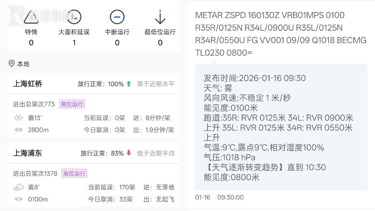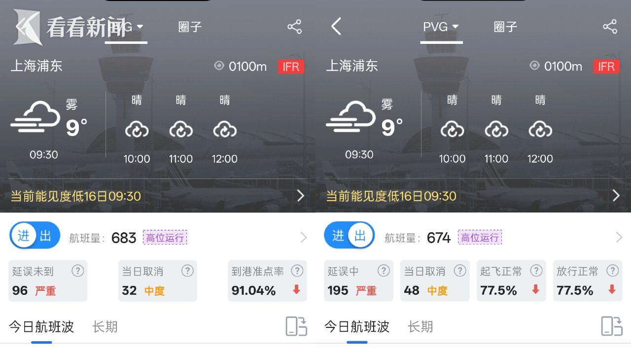 此外,9点半发布的最新气象报文显示,浦东机场能见度仅100米。