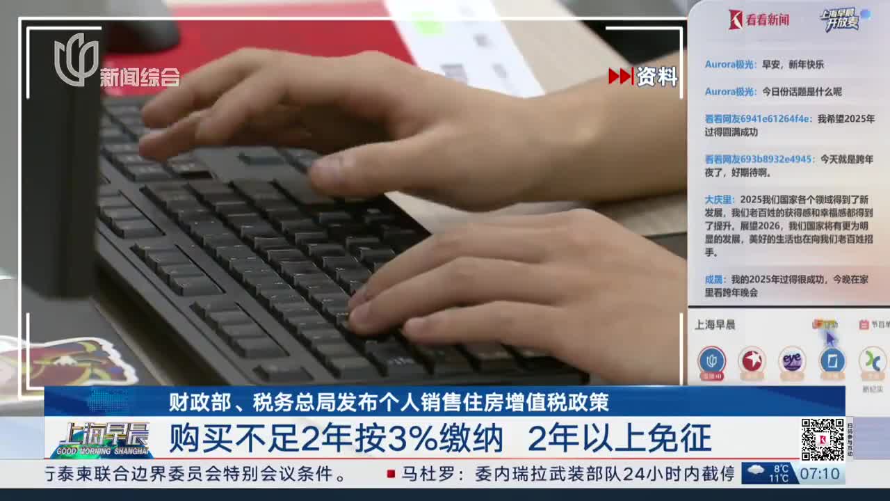 12月30日晚,财政部发布关于个人销售住房增值税政策的公告。个人(不含个体工商户中的一般纳税人)将购买不足2年的住房对外销售的,按照3%的征收率全额缴纳增值税;个人将购买2年以上(含2年)的住房对外销售的,免征增值税。公告自2026年1月1日起施行。