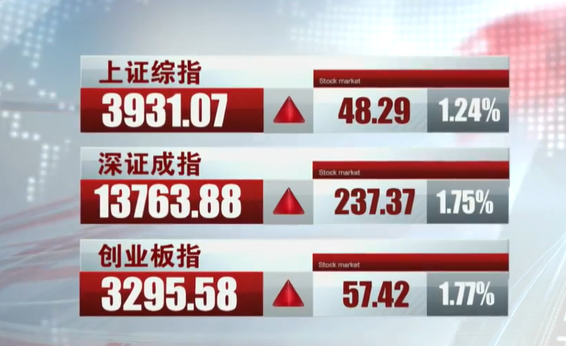 今天,A股三大指数高开高走,突破3900点整数大关,刷新2015年8月以来新高。截至午间收盘,上证综指收报3931.07点,上涨1.24%;深证成指收报13763.88点,上涨1.75%;创业板指收报3295.58点,上涨1.77%。从盘面来看,黄金、有色金属板块领涨。