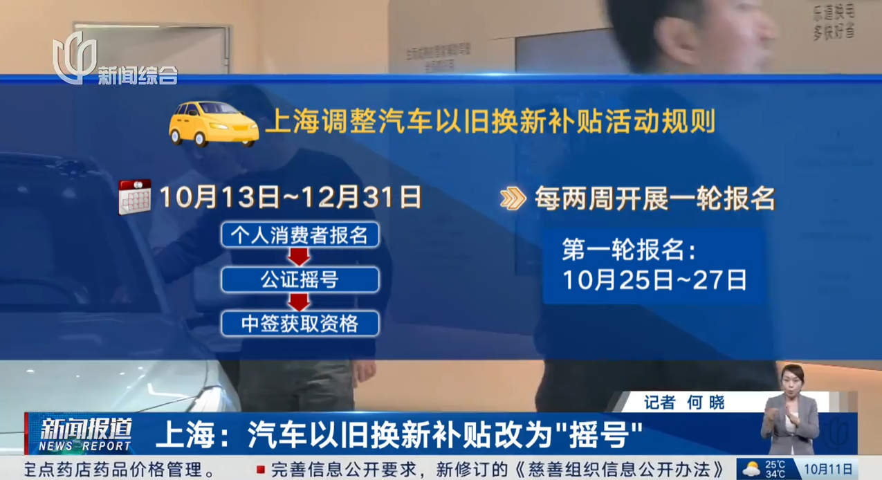 继家电家居以旧换新补贴改为摇号方式后,上海也将调整汽车以旧换新补贴活动规则,自10月13日,也就是下周一开始到今年12月31日,按照个人消费者报名、公证摇号、中签获取资格的方式,开展汽车报废更新和置换更新补贴活动,原则上每两周开展一轮报名,第一轮报名时间为10月25日至27日。