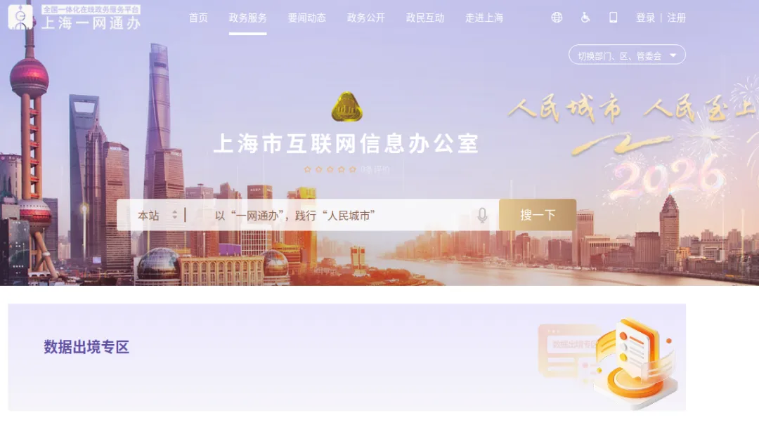 企业和市民可在“中国上海”门户网站(www.shanghai.gov.cn)上通过以下两种方式访问数据出境专区:一是首页“部门办事”模块选择上海市互联网信息办公室,进入后点击专属海报访问;二是在搜索栏输入“数据出境专区”,点击“搜一下”后跳转至专区。