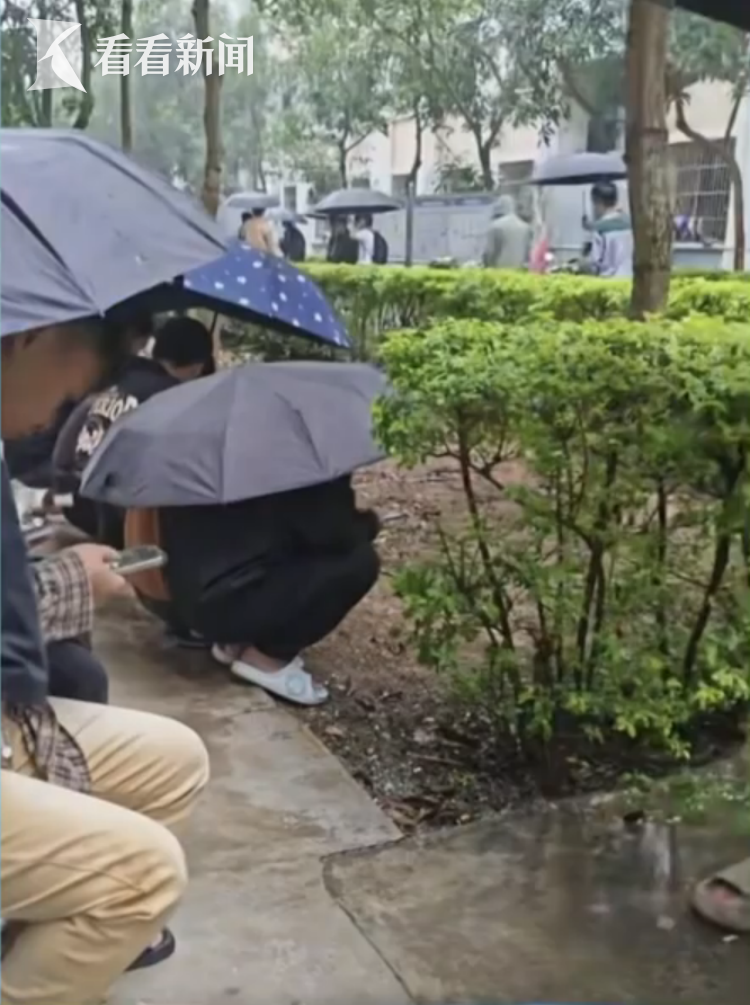 画面显示,雨天里,多名学生撑着伞在户外徘徊,还有学生搬来凳子直接坐在室外。