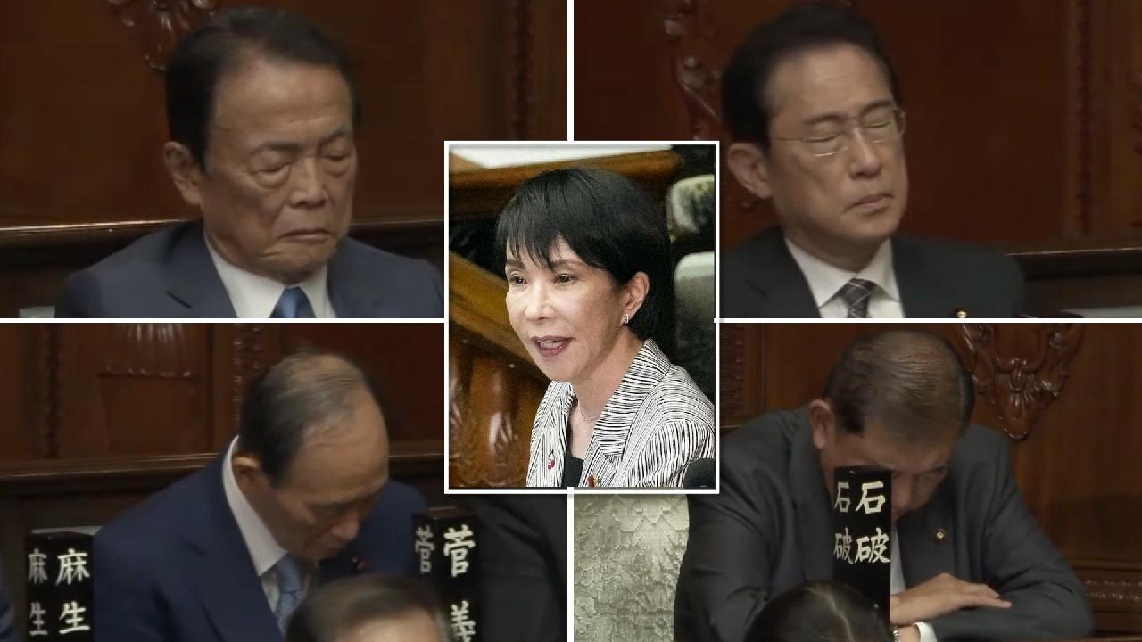 5日,坐在国会现场的几位前首相麻生太郎、菅义伟、岸田文雄和石破茂被媒体拍到同时双目紧闭。其中, 岸田文雄在活动颈椎,其余几位似乎已经入睡。