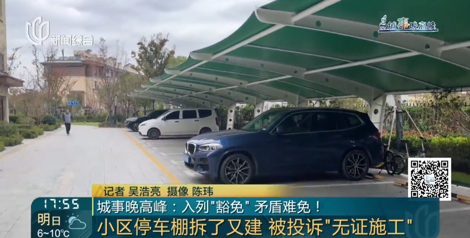 夏望小区是去年6月交付的新小区,居民入住时停车棚就已经安装好了,之后,因为顶棚反光问题,被相邻小区业主投诉,城管判定违法搭建后做了拆除。谁知道,今年3月,被拆的车棚又重建了,而这一次城管却表示,新车棚是合法的存在!这是什么道理呢?来看记者的走访。