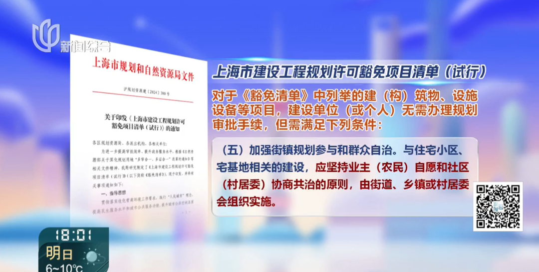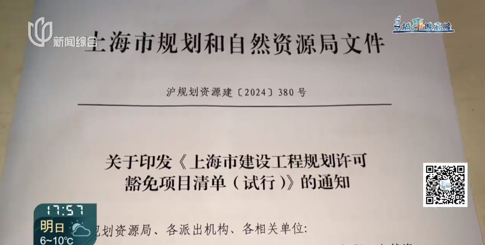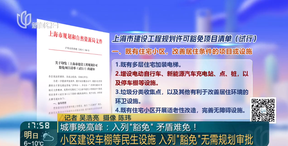 对此,记者特意查询了上海市规划和自然资源局官网,简单来说,它是去年9月,本市推出的一份试行清单,列出了几类建设项目,比如,住宅小区加装电梯、增设电瓶车或新能源汽车的充电桩和车棚、设置垃圾分类点、开展适老化改造,完善无障碍设施等等,可以不用再专门去办规划审批手续了。初衷,也是为了让这些改善居住条件的项目,能更快落地,惠民便民。那走访过程中,记者也咨询了属地城管部门。