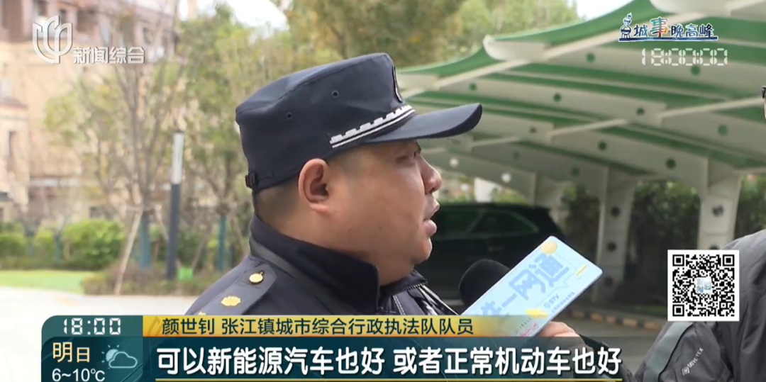 颜世钊 张江镇城市综合行政执法队队员: 他们只需要在这个停车棚里面都安装充电点,或者充电桩就解决了这个问题。其实我们认为它就是一个可以新能源汽车也好,或者正常机动车也好,都可以停放的停车棚。