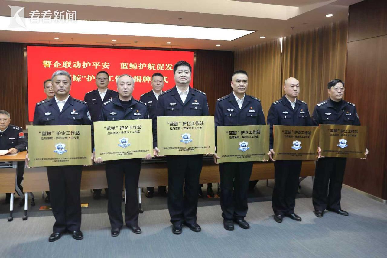 在揭牌仪式现场,边防港航分局、经侦总队、市工商联相关领导向边检、海关、海事、铁检、虹检等5家单位颁发“护企专家团”聘书。同时,边防港航分局下属12家水上、港区、码头派出所作为“蓝鲸”护企工作室被授牌。北外滩航运服务集聚区设立“蓝鲸”护企工作站,每日有分局侦查打击支队民警常驻站内,为码头运营、船舶制造、物流仓储等航运企业提供“零距离”公安服务。