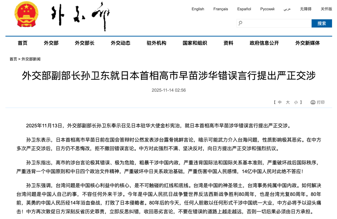 2025年11月13日,外交部副部长孙卫东奉示召见日本驻华大使金杉宪治,就日本首相高市早苗涉华错误言行提出严正交涉。