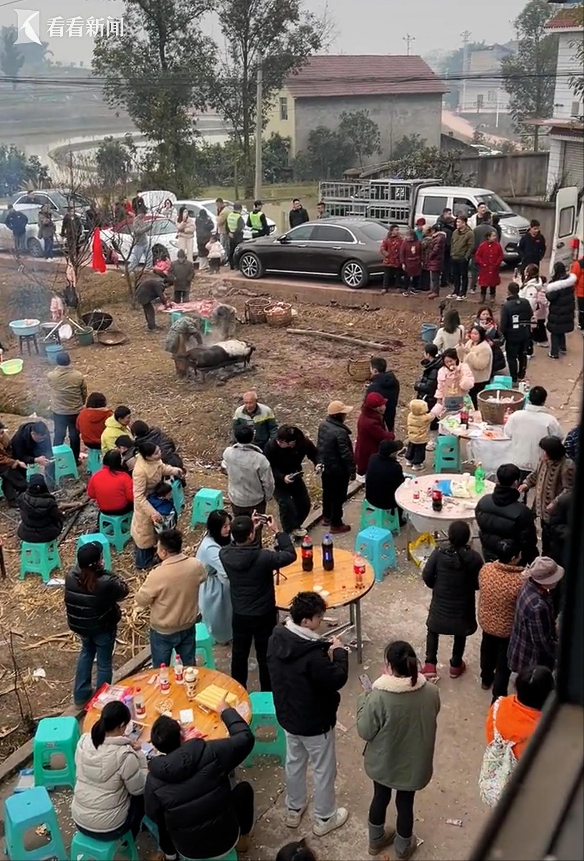 11日清晨5点的庆福村,天色未亮却人声鼎沸。超过4000名网友涌入这个小山村,自发分工忙活起来——有人挽袖上阵帮忙按猪、褪毛,有人钻进厨房切菜烧火,开着宝马的车主蹲在灶边添柴,保时捷车主系上围裙洗碗,场面既热闹又暖心。重庆荣昌的网红“卤鹅哥”专程扛来几大箱卤鹅,热心网友更是直接送来一头肥猪支援。呆呆家原本只准备了2头猪,面对蜂拥而至的人群,食材远远不够。关键时刻,合川文旅部门紧急介入,连夜采购2头本地特色黑猪救场,才让杀猪宴日顺利进行,多方联动让这场自发的聚会井然有序。
