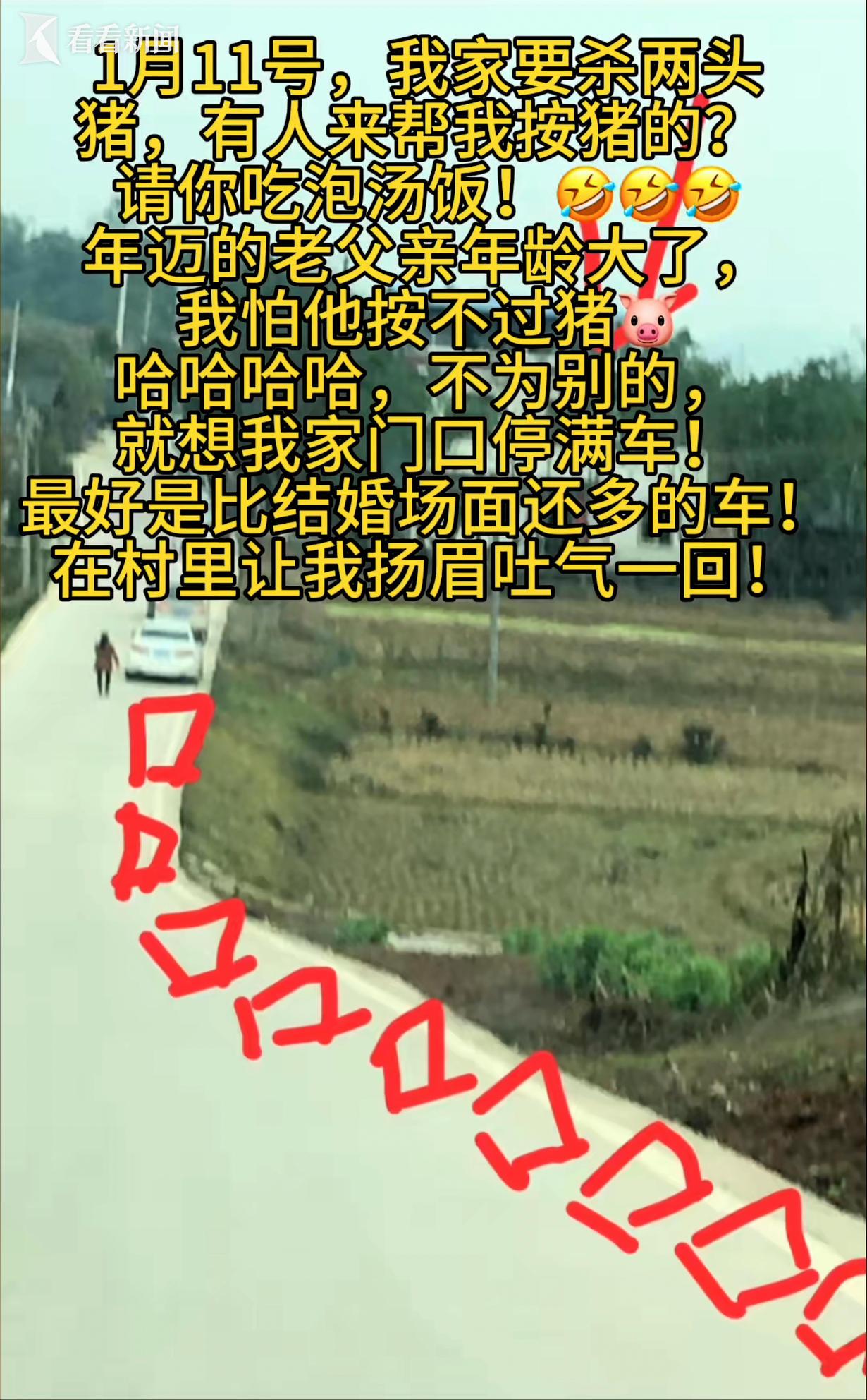 1月11日,重庆合川区云门街道庆福村的村道上,渝、川、黔、粤等地的车辆排成长龙,数千名网友从四面八方奔赴而来,只为赴一场“杀年猪、吃刨猪汤”的朴素约定。这场轰动全网的盛会,缘起于两天前一位姑娘的一条短视频求助。