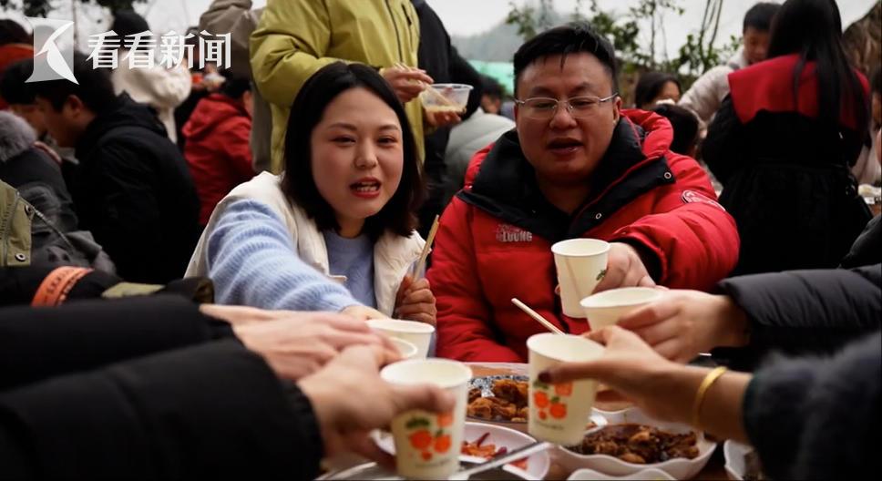 从白天到深夜,流水席从院子一路摆到田埂,数千人分波次轮换用餐,不少人蹲在路边端着碗,依然吃得津津有味。傍晚时分,篝火晚会点燃了整个村庄的夜空。与此同时,这场盛会的线上直播间热度爆棚,最高在线人数突破10万,累计点赞超400万,网友们隔着屏幕直呼“这才是真正的人间烟火气”。