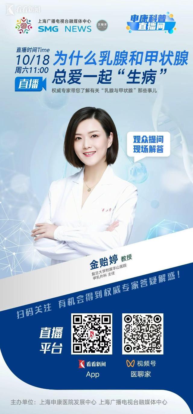 乳腺和甲状腺疾病是困扰女性健康的两大常见问题。根据国家癌症中心的最新统计,2022年中国乳腺癌新发病例数为35.72万例,在女性癌症中仅次于肺癌,占女性恶性肿瘤总发病人数的15.59%。该统计还显示,2022年我国甲状腺癌新发病例数达到44.6万例,女性发病率为34.1万例,在女性恶性肿瘤中新发病例数位居第三位。临床上经常发现,许多女性同时或相继面临这两种疾病的困扰。为何这两个看似不相干的器官总爱一起“生病”?值此“世界乳腺癌防治月”,我们请来复旦大学附属华山医院甲乳外科主任金贻婷教授,由她来为大家揭秘两大腺体的关联。