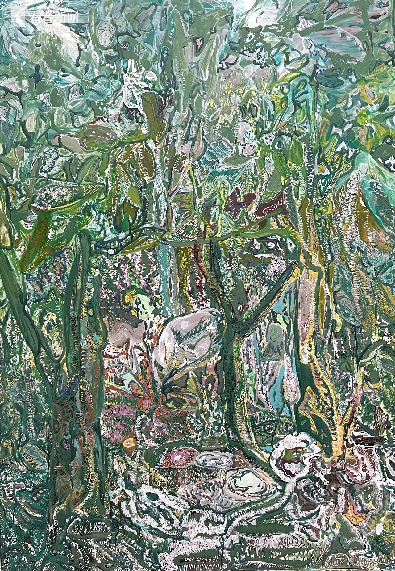 作品《时间森林》与《仲夏之梦》则由不同的材质与情感组成,流动性的笔触、交织的色块,仿佛夏日的梦境,在现实与梦幻之间,长出一片朦胧的森林。
