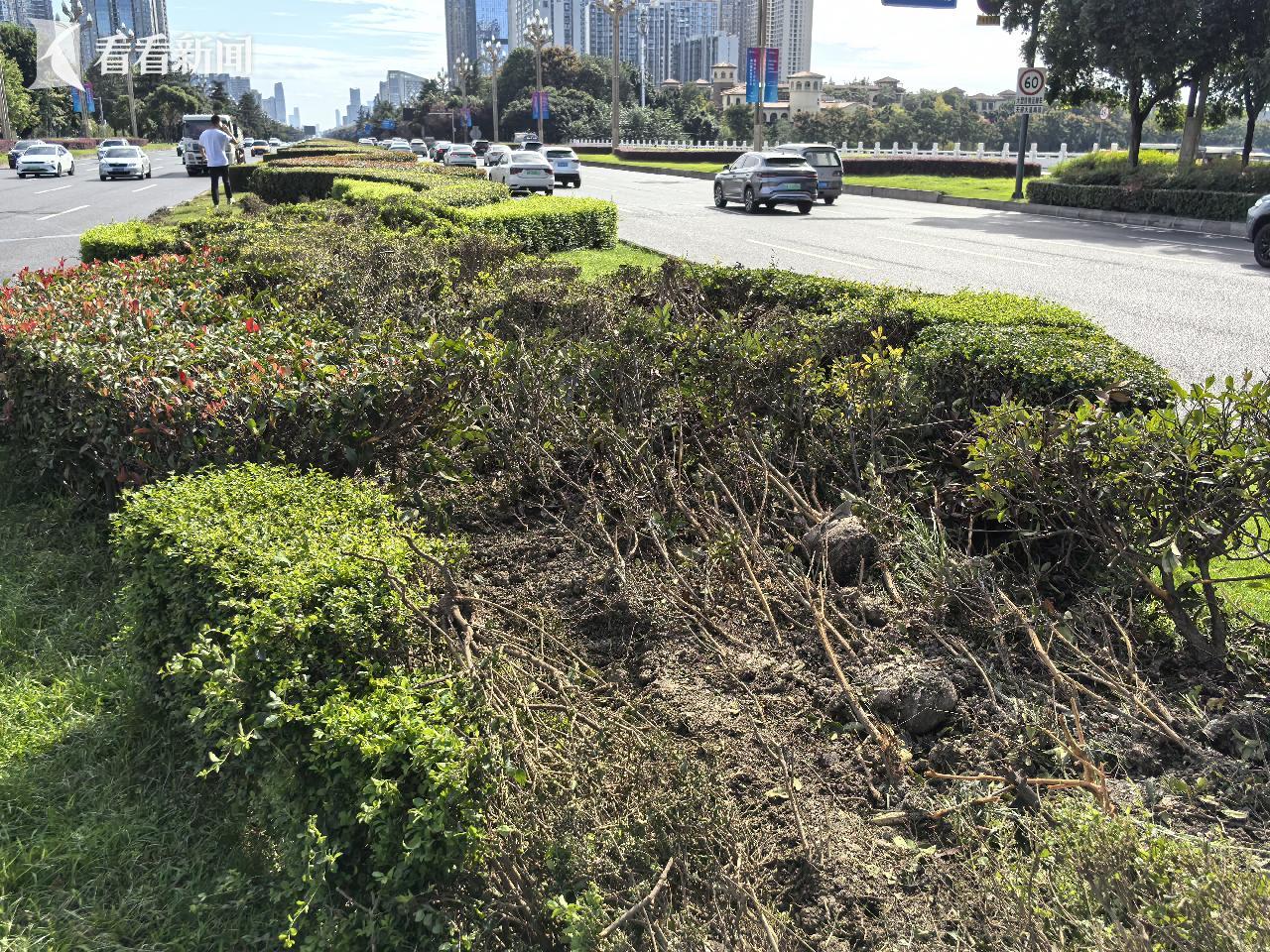 今天中午,当记者赶到事发路段时,依然可见事故发生后,留下的惨烈现场。事发现场,地面留有明显车辙印,中央绿化带的路沿及灌木丛延续五十米左右,至少有四处遭到破坏。在道路东侧的主车道上,留下了新能源车燃烧后的黑色印记。