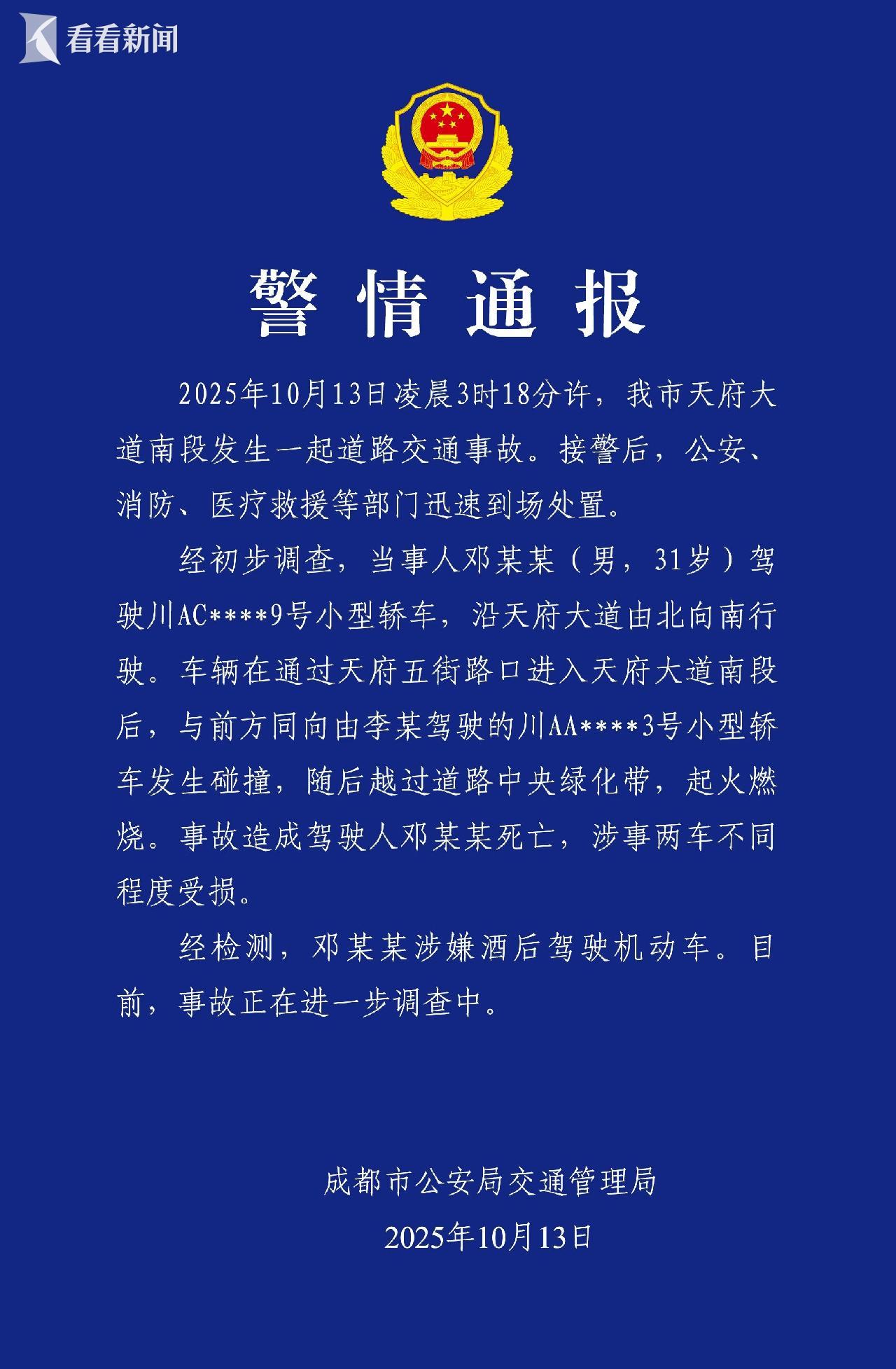 今天下午,成都市发布警情通报。今晨事故发生后,成都公安、消防、医疗救援等部门迅速到场处置。经初步调查,当事人邓某某(男,31岁),驾驶小型轿车,沿天府大道由北向南行驶。车辆在通过天府五街路口进入天府大道南段后,与前方同向小型轿车发生碰撞,随后越过道路中央绿化带,起火燃烧。事故造成驾驶人邓某某死亡,涉事两车不同程度受损。经检测,邓某某涉嫌酒后驾驶机动车。目前,事故正在进一步调查中。