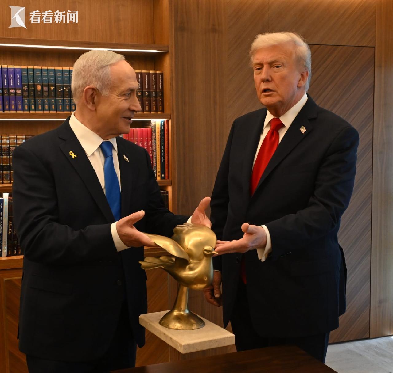 当天,以色列总理内塔尼亚胡在社交媒体发照片,向特朗普赠送了一座“金色和平鸽”雕塑作为礼物。特朗普4小时“旋风访以”后前往埃及。美国、埃及、卡塔尔和土耳其在埃及沙姆沙伊赫签署了关于加沙停火协议的文件。特朗普称,加沙地带停火协议第二阶段谈判“已经开始”。