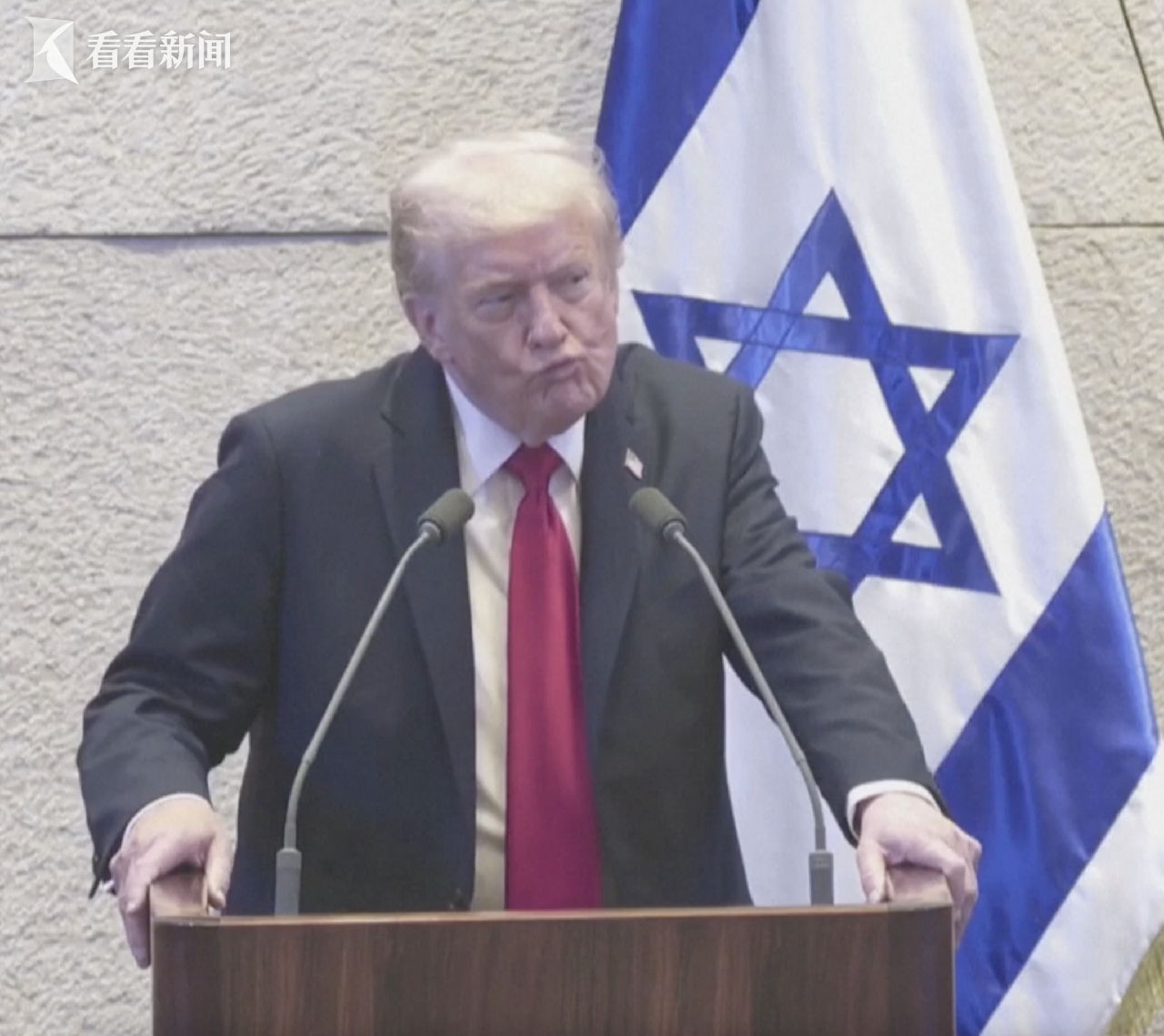 当地时间10月13日,美国总统特朗普在以色列议会演讲时被两名以色列议员抗议打断,当场撅嘴。
