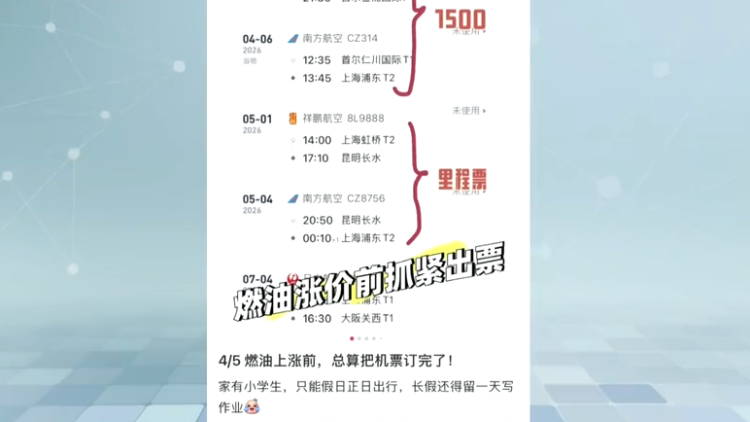 受中东局势持续影响,国际油价震荡,全球多家航司密集上调国际机票燃油费。多家机构预测,若油价维持高位,届时国内航线燃油费或上调至50元左右。清明假期、五一假期即将接连到来,不少网友在社交平台发帖称,赶在燃油附加费上涨前,提前囤购了机票,有人甚至买好了一整年的机票。不少网友在社交平台发帖称,赶在燃油附加费上涨前,提前囤购了机票,能买的都买了。