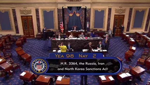 美国参议院27号以98票赞成、2票反对的表决结果通过一项针对俄罗斯、伊朗和朝鲜三国的制裁议案。根据该议案,美国将以俄罗斯涉嫌干涉美国2016年总统选举和乌克兰危机等为由,追加对俄相关个人和实体的经济制裁,并以发展弹道导弹项目等为由,对伊朗和朝鲜实施新制裁。
