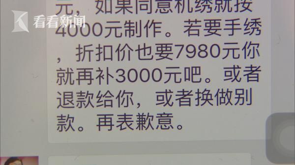 高女士向店方投诉后,旗袍工厂的负责人王先生通过微信联系了高女士。称这款旗袍有“机绣”和“手工绣”两个版本,价格差好几千。当时营业员没了解清楚,开错了价。现在,高女士有三个选择,要么做机绣,要么补差价做手工绣,要么可以退款。但高女士都不能接受。