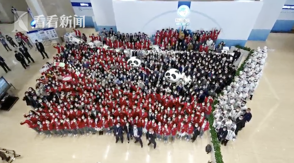 第三届进博会即将落下帷幕。下午两点半,工作人员和志愿者们在新闻中心底楼合影留念。