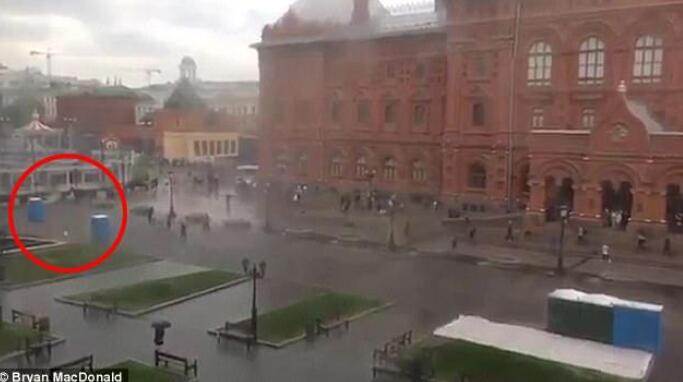 这段拍摄于莫科斯红场附近的视频显示,路边的移动厕所在大风中"狂奔"起来,附近的行人纷纷奔跑避让,以免被快速移动的厕所间撞伤。