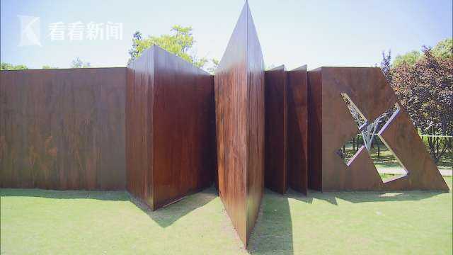 即便是工作日,仍有不少家长带着孩子到位于银都路旁的银都绿地踏青,做游戏、骑小车、踢足球,玩得不亦乐乎。不过就在草坪上,有一座咖啡色的铁质雕塑十分显眼。尤其是雕塑附有大大小小多几个锐角,它们直直地对着大草坪,看上去就像一把把刀锋。