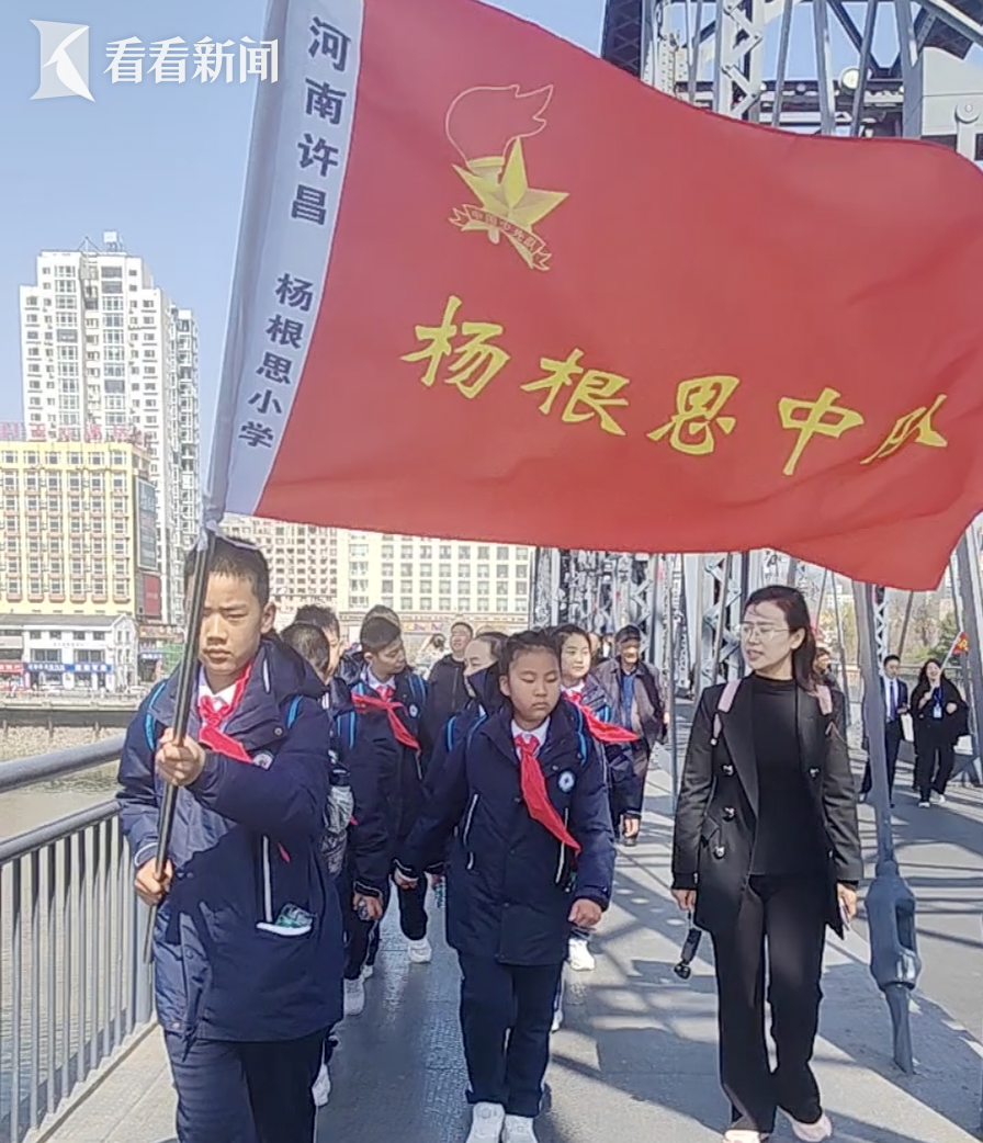 4月21日,辽宁丹东市鸭绿江畔,江苏泰兴、河南许昌的孩子们,带着故乡的土,踏上英雄当年出征的路,他们在江风中敬队礼,声声宣言,是英雄的传承。