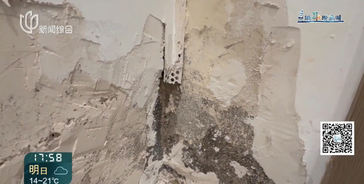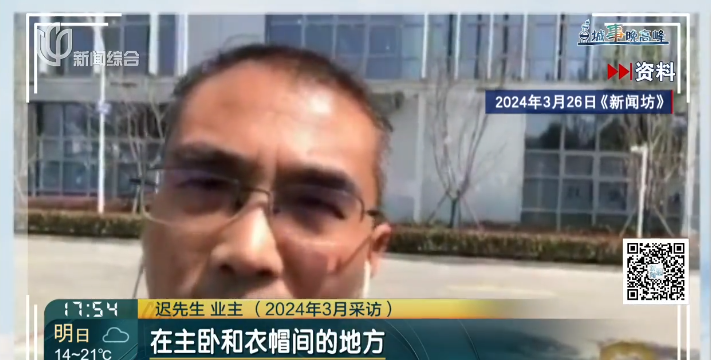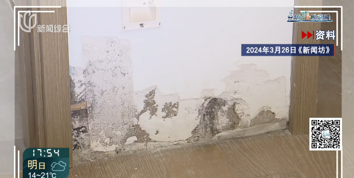 迟先生在2024年3月26日播出的报道中反映,2022年6月底拿到精装修新房,半年后走进新家,却看到客厅一侧墙面下半部分都是潮湿的,卧室也有渗水。房修人员上门检修,也没能解决问题,此后渗水情况又出现了两次。由于始终不能彻底解决,迟先生一家人一直无法入住新家。