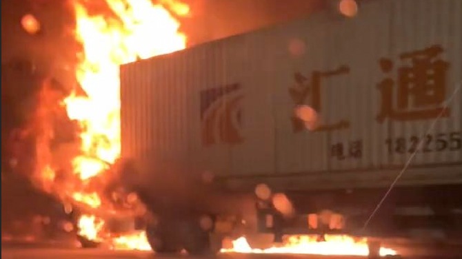 上海外环高速一货车起火 目前火已灭