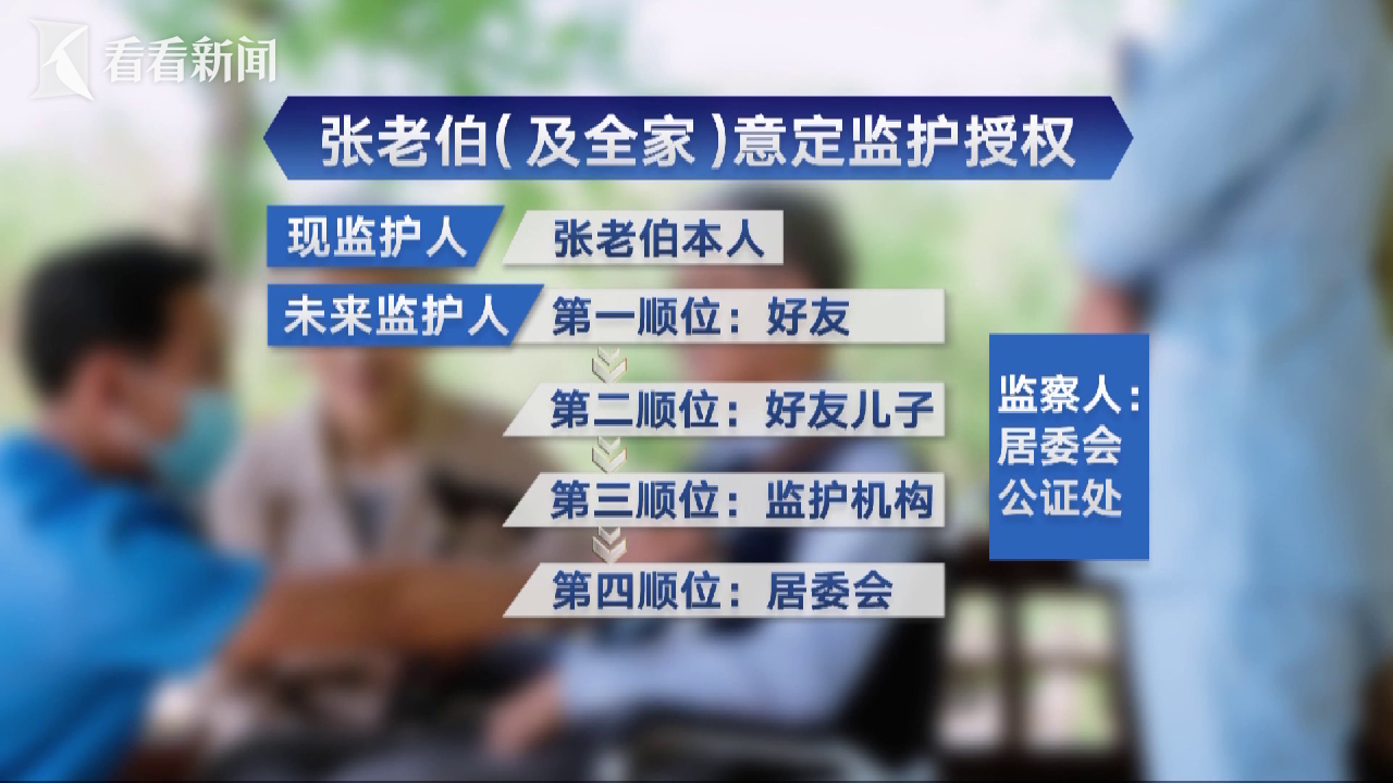 目前,张老伯仍是妻儿的监护人,但考虑到自己的身体状况,他委托自己的一位同龄好友作为第一顺位监护人,而好友的儿子则作为第二顺位监护人,政府部门认可的监护机构为第三顺位监护人,居委会为第四顺位监护人,同时和公证处一起,在整个过程中作为监察人。