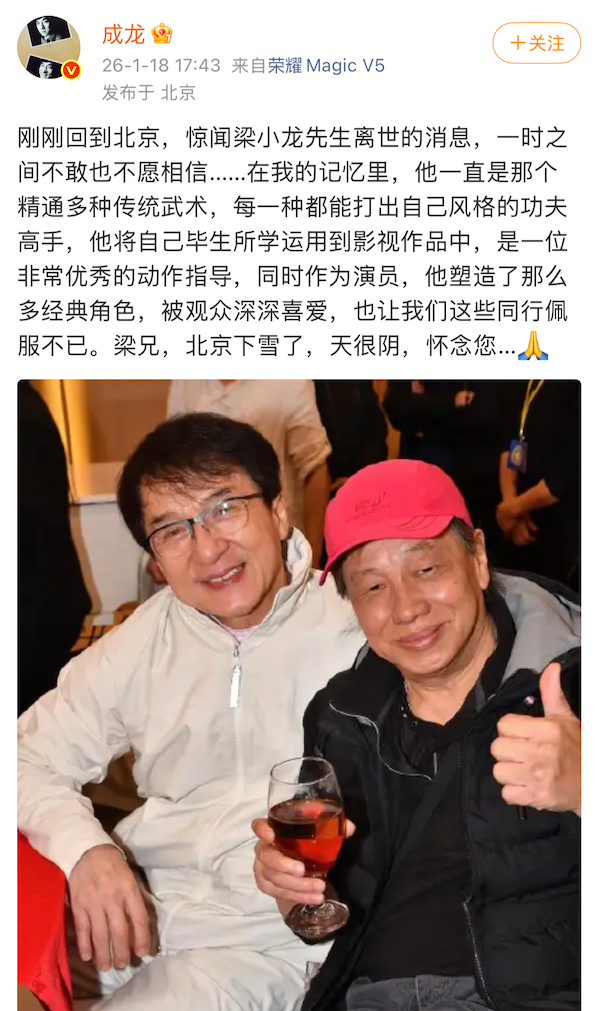 刚刚回到北京,惊闻梁小龙先生离世的消息,一时之间不敢也不愿相信……在我的记忆里,他一直是那个精通多种传统武术,每一种都能打出自己风格的功夫高手,他将自己毕生所学运用到影视作品中,是一位非常优秀的动作指导,同时作为演员,他塑造了那么多经典角色,被观众深深喜爱,也让我们这些同行佩服不已。梁兄,北京下雪了,天很阴,怀念您…