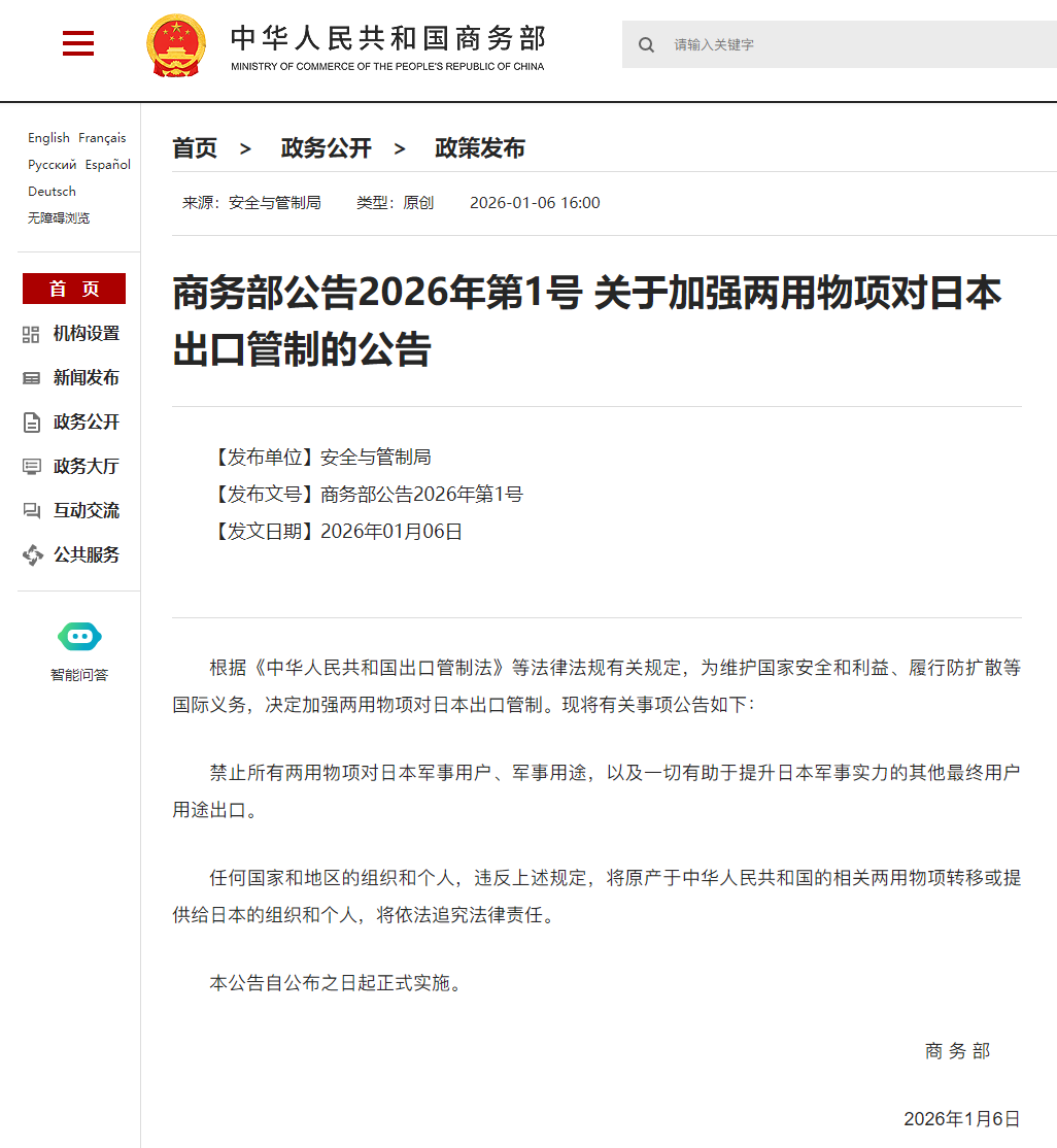 禁止所有两用物项对日本军事用户、军事用途,以及一切有助于提升日本军事实力的其他最终用户用途出口。