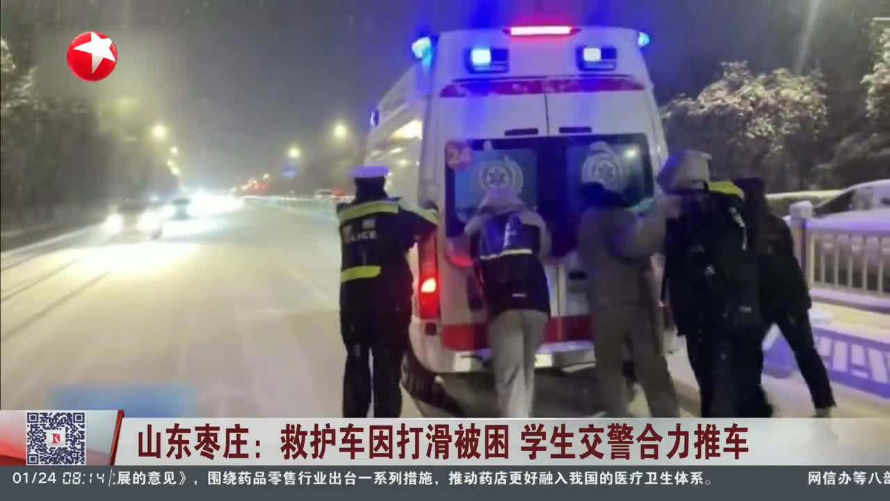 山东枣庄:救护车因打滑被困 学生交警合力推车