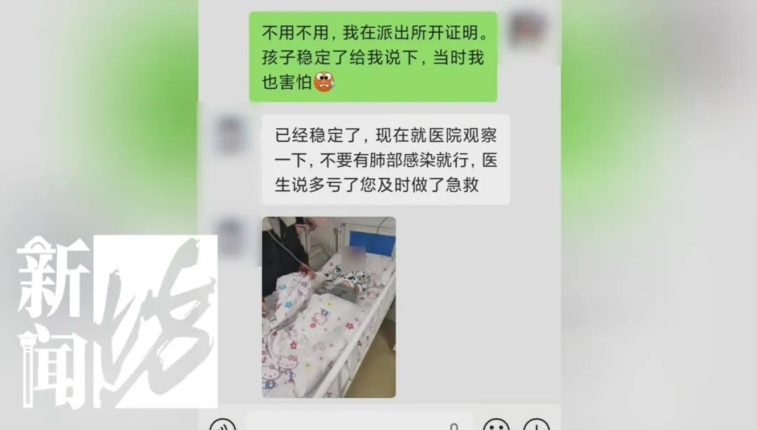 当天10号下午,我送完餐不忙了,就给他父亲发微信,问小孩怎么样了?孩子父亲说,小孩有点低烧,可能受惊吓,咳嗽多一点,肺部稍微轻微感染,但医生说没有大碍,只要脑部不缺氧都行。然后到晚上9点多钟的时候,父亲又给我发一段小孩的视频,说小孩已经开始能吃东西了。昨天下午5点钟,他们就出院了。