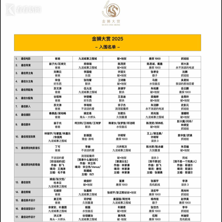 金狮大赏(GSA)组委会今日(11月11日)公布首届17个奖项类别的提名名单。作为新加坡通信媒体发展局IMDA主办的新加坡媒体节(SMF)的重要活动之一,金狮大赏由新加坡午言媒体NoonTalk联合半路出彩VPicture联合承办,旨在表彰在华语电影过去一年中的优质作品,肯定华语电影从业人员的贡献和付出,鼓励华语电影的创新与进步。首届金狮大赏颁奖典礼将于2025年12月1日举行。