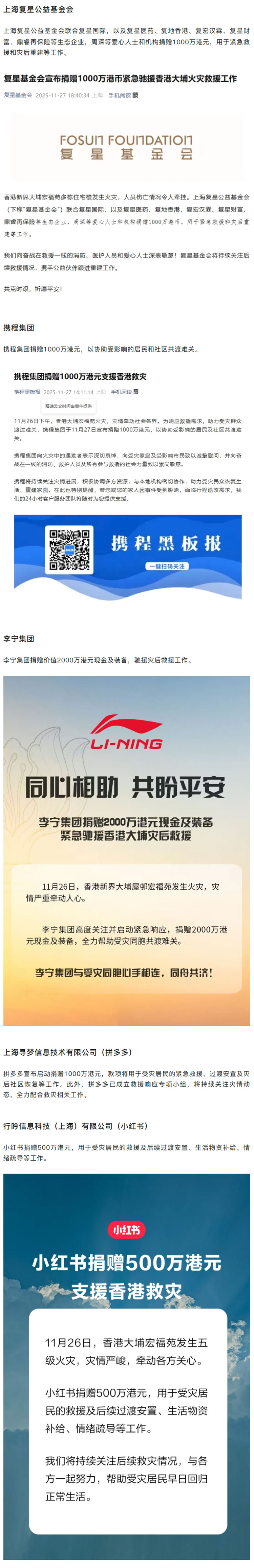 11月26日,香港新界大埔区宏福苑发生火灾,造成重大人员伤亡。灾情牵动全体中国同胞的心,沪上民营企业纷纷伸出援手,驰援香港大埔灾后救援→