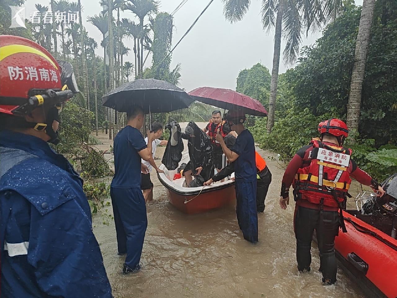 8时04分,琼海市消防救援支队指挥中心接到报警,万泉镇沐皇村2人被困槟榔园。消防救援人员到达现场后了解到,积水最深处已达3米左右,现场借助群众渔船转移被困者。9时26分,被困者被安全转移。